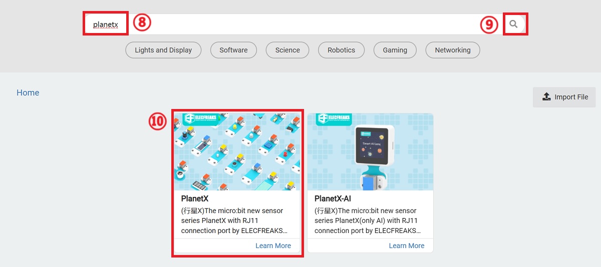 For å gjøre dette trykker man på **Utvidelser/ Add Package**. Det åpner seg da en ny meny hvor vi søker etter og velger PlanetX. Utvidelsespakken vil da laste ned og legge seg i menyen til venstre for redigeringsskjermen.